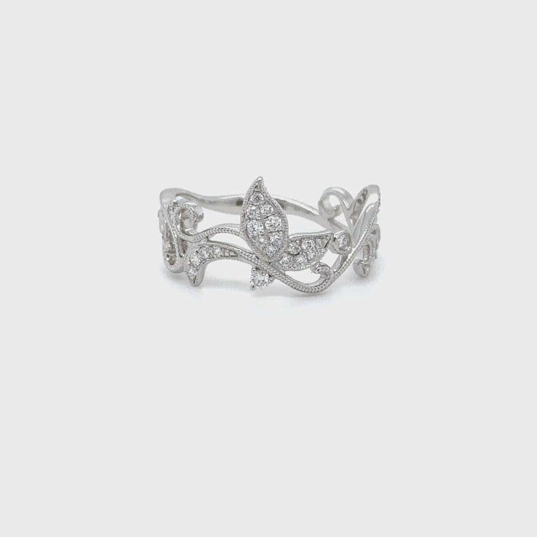 A stunning masterpiece crafted in exquisite 18ct white gold. This exceptional ring showcases a breathtaking display of nature-inspired design, with intricate diamond-encrusted filigree leaves delicately finished with subtle milgrain edging. Elevate your style and embrace the enchantment of nature with this Flora Filigree Diamond Ring.